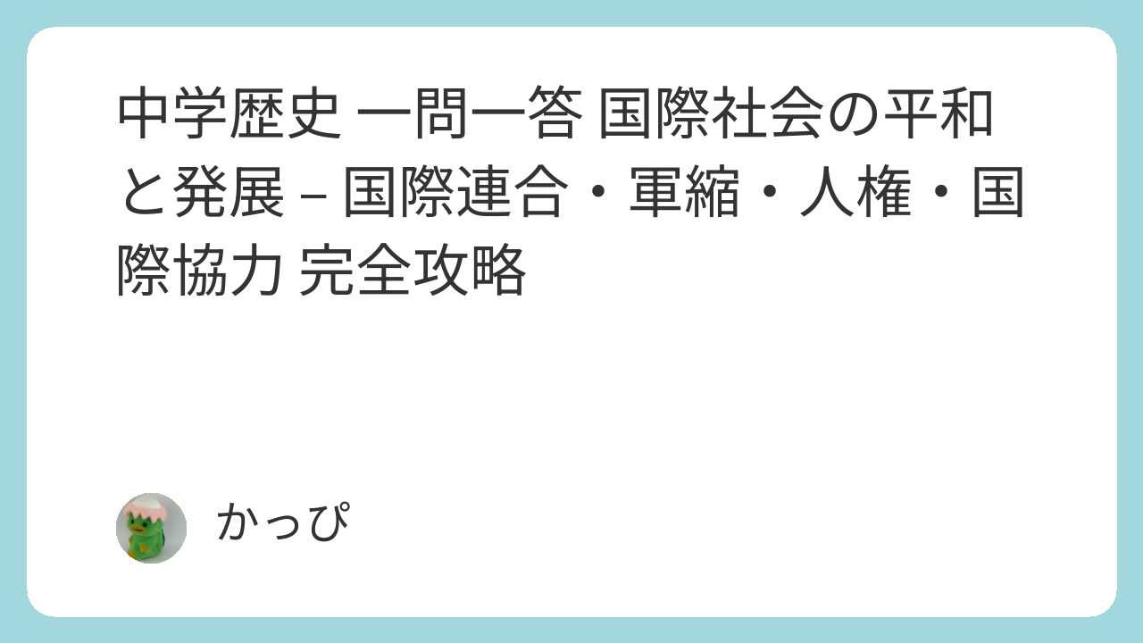 中学歴史「国際社会の平和と発展」の重要ポイントを50問で徹底マスター!国際連合、地域紛争と平和構築、軍縮と核兵器問題、人権と人道支援、国際協力と開発援助など、現代国際社会の課題を完全網羅。定期テスト対策に最適です。