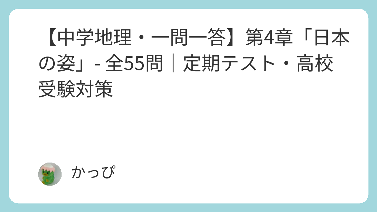 この一問一答は、中学地理第4章「日本の姿」の重要事項を55問にまとめた学習ツールです。日本の位置・領域、地形、気候、都道府県などの基礎知識を効率的に身につけることができます。定期テスト対策や高校受験の基礎固めに最適です。